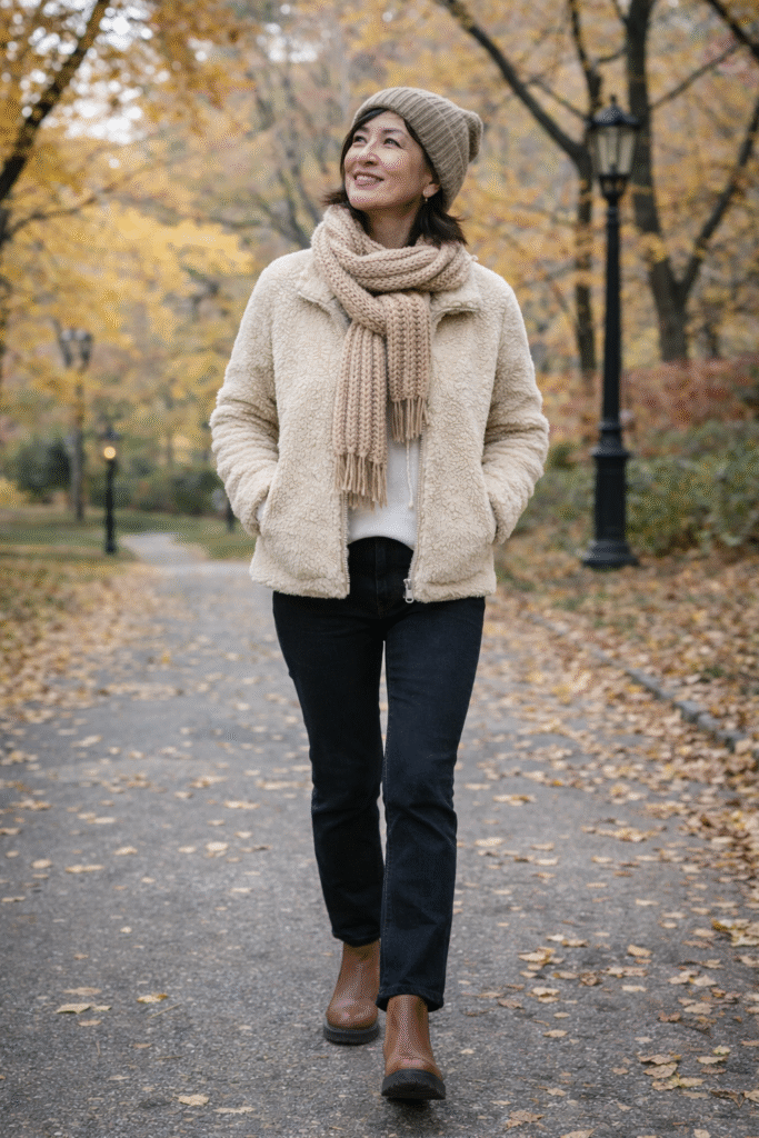 3. Cream Fuzzy Jacket + Beige Scarf + Black Jeans (Park Walk Look)