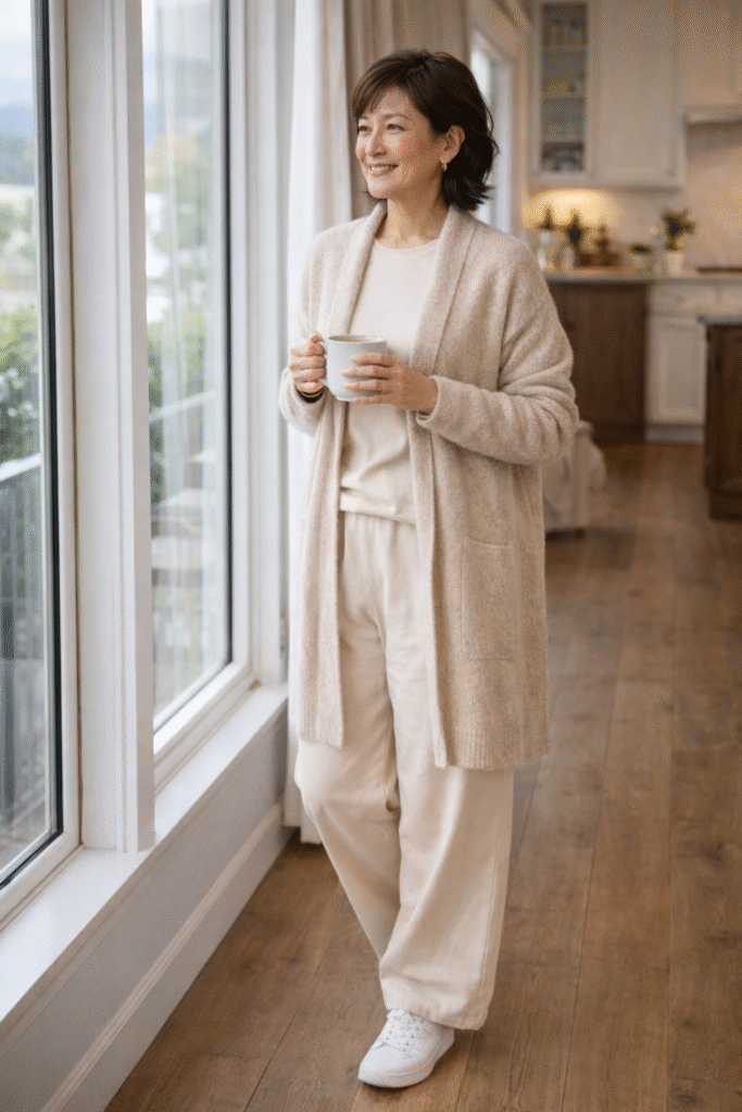 6. Beige Long Cardigan + Cream Knit Set (At-Home Cozy Look)