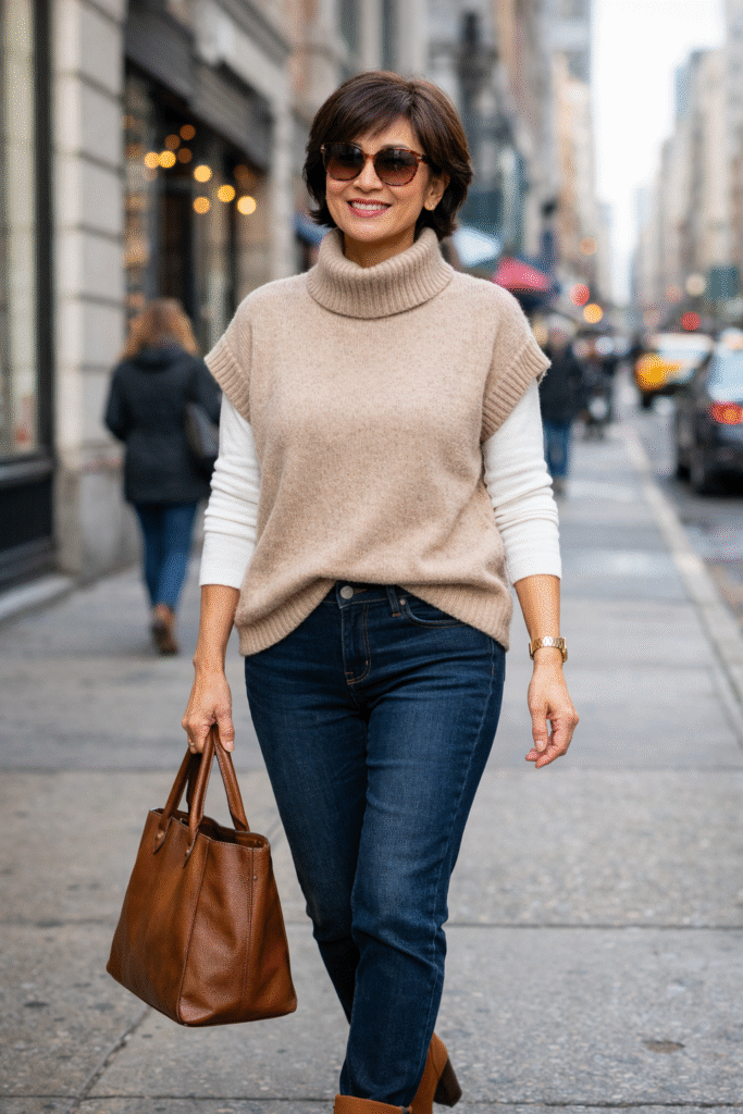 A winter staple. The vest adds warmth without bulk. The knit brings softness. Finish with ankle boots or sneakers for casual days.