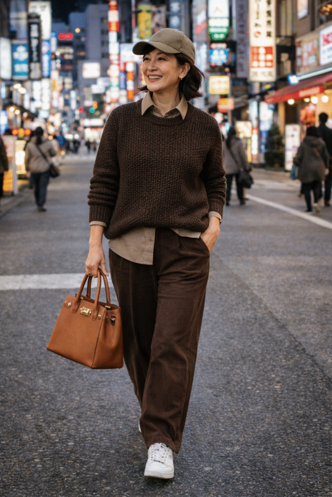 This outfit leans into earthy tones that feel rich and grounded. A chunky brown sweater layered over a button-down adds depth, while soft baggy pants keep the silhouette relaxed. White sneakers modernize the look, and a structured leather bag adds sophistication. The baseball cap keeps it casual and current.