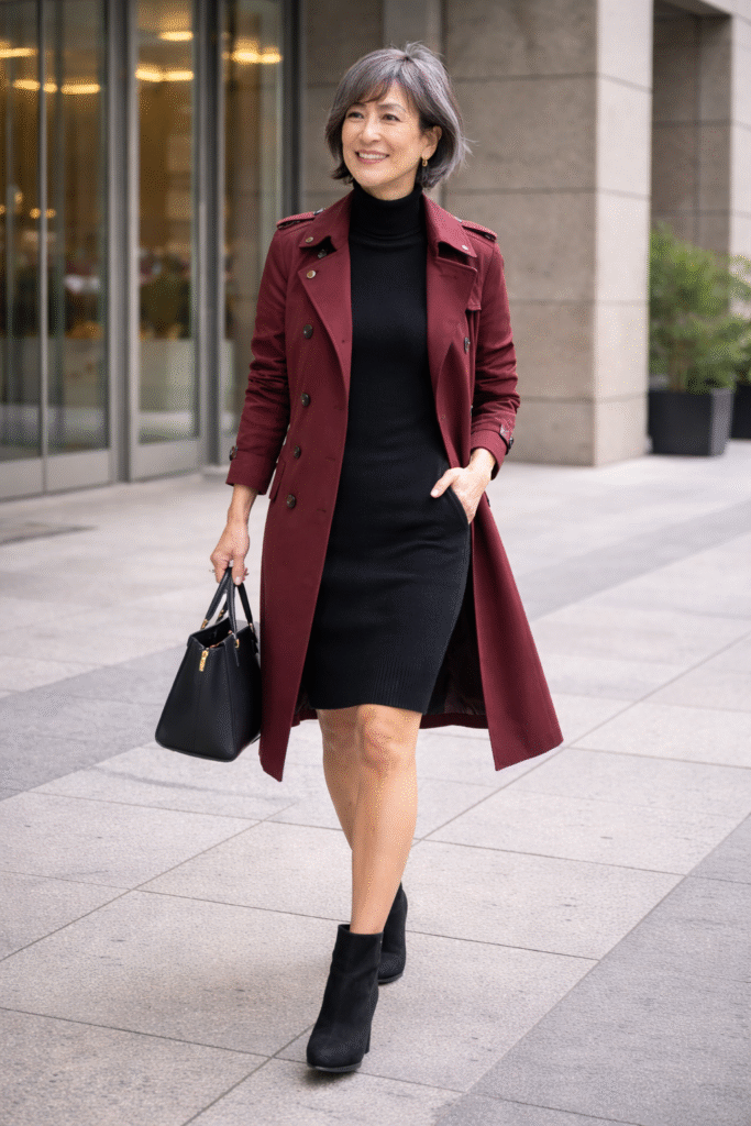 This outfit is the perfect balance of polished and powerful. The black sweater dress creates a clean, flattering silhouette, while the maroon trench coat adds richness and structure without feeling heavy.