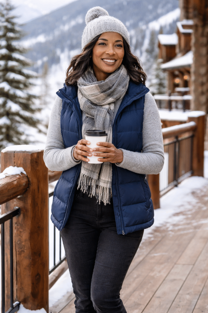 This outfit is perfect for winter travel. A blue puffer vest adds warmth without heaviness, layered over a gray long-sleeve top. Black jeans keep things simple, while ankle boots add stability. A scarf and beanie finish the look, making it both functional and stylish for mountain mornings with coffee in hand.