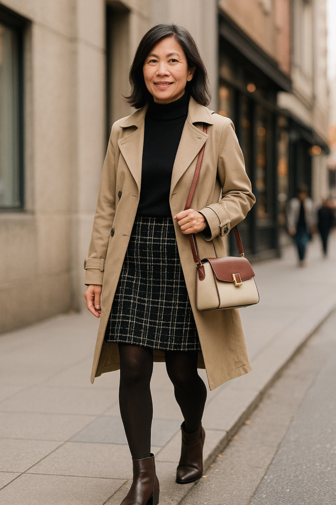 A black turtleneck sweater tucked into a tweed skirt, layered with a beige trench coat and brown ankle boots, captures that classic “city fall” vibe.