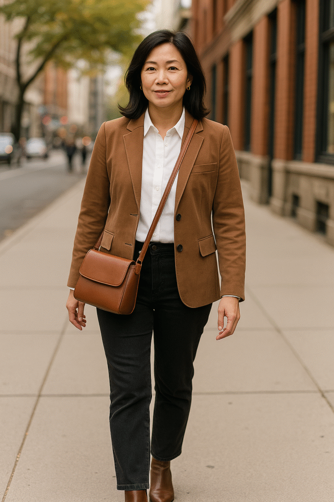 A beige suede blazer over a white top and black pants, finished with brown boots and a brown handbag, makes for a refined, modern look.