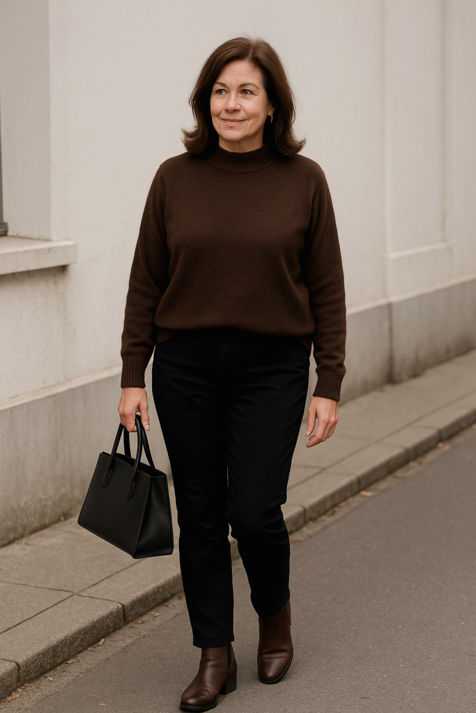 A brown sweater paired with black pants is simple, timeless, and chic. The rich brown brings warmth, while the black pants keep the look sharp and flattering. Finish it off with ankle boots and a structured bag — perfect for workdays or dinner nights.