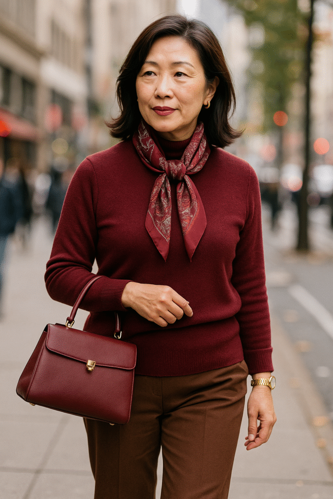 Or go subtle — a wine scarf, handbag, or lip color can bring warmth to a neutral outfit.