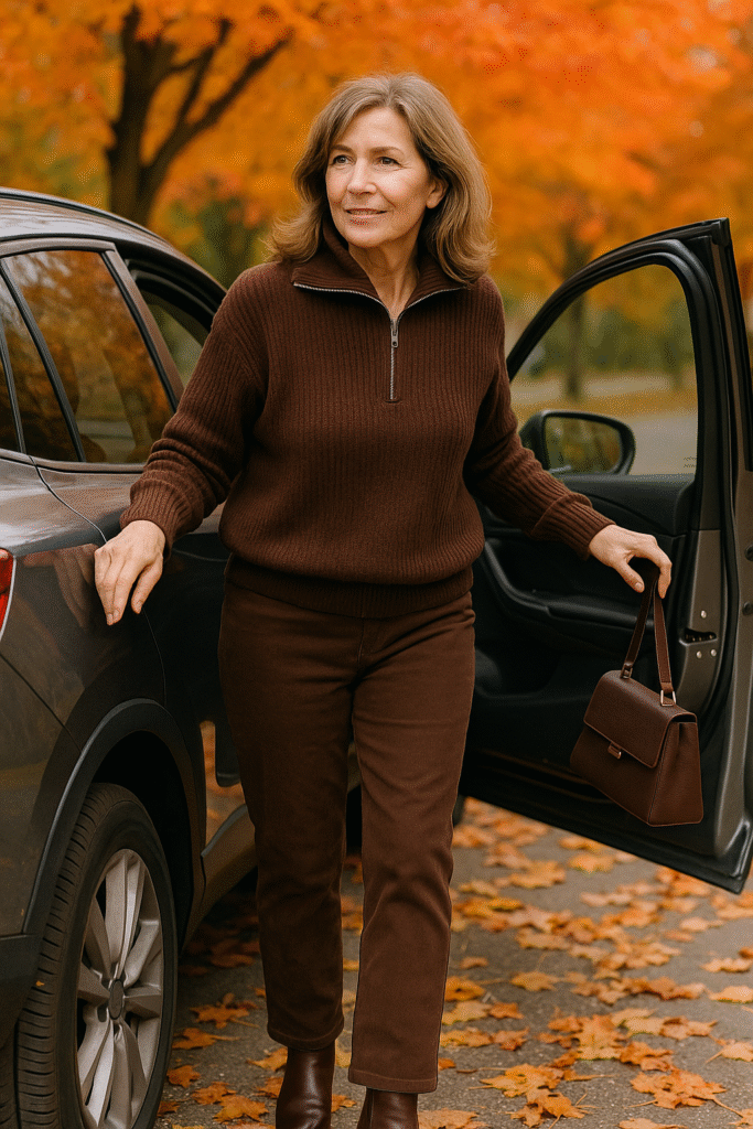 It’s cozy yet refined — the textures do the talking while the matching tones keep it polished. Add gold jewelry or a beige bag, and you’ve got a modern, head-to-toe brown moment that feels both elegant and easy to wear.